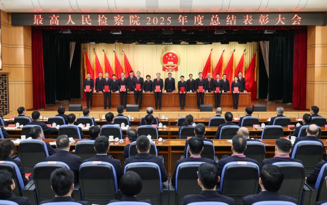 2月12日,最高人民检察院举行2025年度总结表彰大会,回顾过去一年工作,表彰表扬机关优秀部门和先进个人,展望新一年工作。最高检党组书记、检察长应勇出席会议并讲话。最高检党组副书记、常务副检察长童建明主持会议,党组成员、副检察长葛晓燕宣读最高检从检30年检察荣誉章获得者名单,党组成员、政治部主任滕继国宣读最高检2025年度考核表彰决定。出席会议的最高检领导、检委会专职委员为检察荣誉章获得者和优秀部门、立功及考核优秀个人代表颁奖。